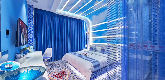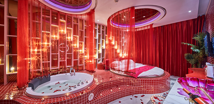 36間心動主題房,演繹浪漫情懷,智能音影,按摩浴缸護航溫馨之夜。