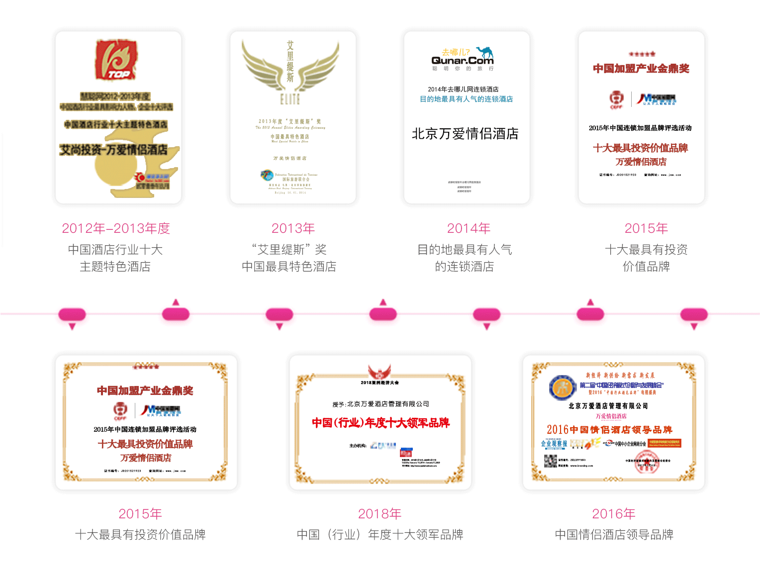 2011年,萬愛品牌創(chuàng)立;中國D一家情侶主題酒店——萬愛情侶酒店北京馬甸店開業(yè)。作為中國情侶酒店的締造者,8年來,萬愛憑借其專業(yè)的投資和運營管理模式,先后榮獲“中國酒店行業(yè)十大主題特色酒店” “'艾里緹斯'中國最具特色酒店” “中國情侶酒店領(lǐng)導(dǎo)品牌” “中國連鎖加盟十大最具投資價值品牌”“'美團點評'最受歡迎商戶”等多項殊榮。
