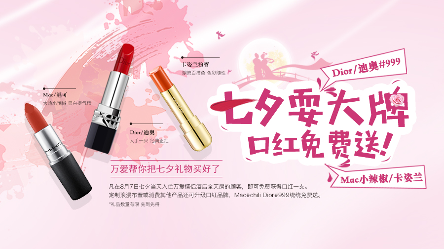 這次的七夕我們將發(fā)送總價(jià)超10萬的口紅,可謂是豪氣滿滿。Carslan粉管都只是入門級的驚喜,定制浪漫布置或店內(nèi)消費(fèi)其他產(chǎn)品還可以升級口紅品牌,號稱“人手一支”的Mac#chili、小愛做夢都想要的Dior#999都將免費(fèi)送給愛粉們,簡直不要太超值,相信再沒有哪家情侶酒店的七夕福利比萬愛更豐厚的了。誰不想擁有長長久久的愛情,一年365天等一個七夕,就該配上萬愛獨(dú)有的私人訂制浪漫布置。燭光、玫瑰、搖晃的紅酒杯,再加上心愛的她,一切都是剛剛好的樣子。玫瑰的馨香遇上口紅的純情蜜意,送她一場難忘的浪漫與感動。愛不一定要說出來,但你的心意一定要讓她明白。