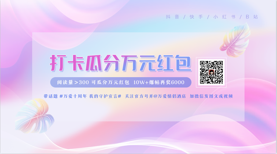 6/15前在小紅書/抖音/快手/B站,發(fā)布話題圖文故事或視頻,記錄此時(shí)此刻的你們,相約下一個(gè)10年,完成打卡即可瓜分10000元現(xiàn)金。打卡條件:帶話題#萬(wàn)愛(ài)十周年 我的守護(hù)宣言# ,關(guān)注萬(wàn)愛(ài)官方號(hào)并@萬(wàn)愛(ài)情侶酒店。